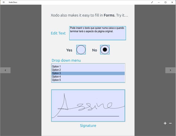 4. Assumindo que um PDF foi enviado correctamente, pode usar o Xodo para o preencher. Carregue numa caixa de texto e escreva o que quiser. Clique em qualquer lugar fora da caixa e o seu texto será guardado. Também pode acrescentar respostas ao carregar sobre os botões de opção e nos menus dropdown. Insira a sua assinatura carregando na caixa.