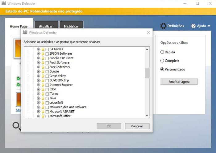 Usar o Windows Defender para fazer uma análise ao computador de vez em é aconselhado; pode escolher uma entre três tipos. A ‘Rápida’ é a que deve fazer com mais frequência: só procura nos sítios onde normalmente está o malware e não demora muito. A ‘Completa’ procura em todo o PC e é mais utilizada para acabar com quaisquer restos, quando já se tratou da “infestação”. A ‘Personalizada’ permite especificar os locais a serem analisados.