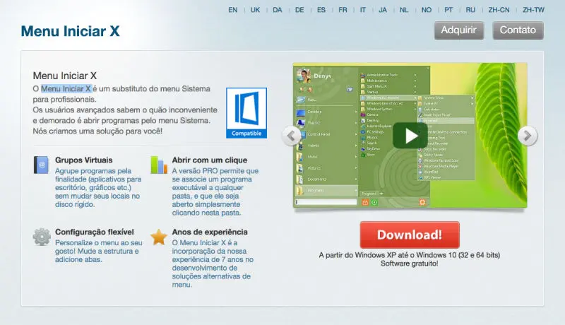 O programa que vamos usar para nos ajudar a tornar o menu ‘Iniciar’ do Windows mais simples de usar é o Menu Iniciar Х, cujo download pode ser feito aqui. Clique no botão vermelho que está à direita para começar a descarregar o ficheiro de instalação. Quando terminar, dê um duplo clique e siga as instruções que vão aparecendo. Na segunda janela, seleccione a opção ‘Free version’, e nas próximas carregue no botão ‘Seguinte’ e em ‘Instalar’ para concluir o processo. Agora, quando carregar na tecla ‘Windows’ do seu computador vai ver que o menu ‘Iniciar’ já vai aparecer diferente.