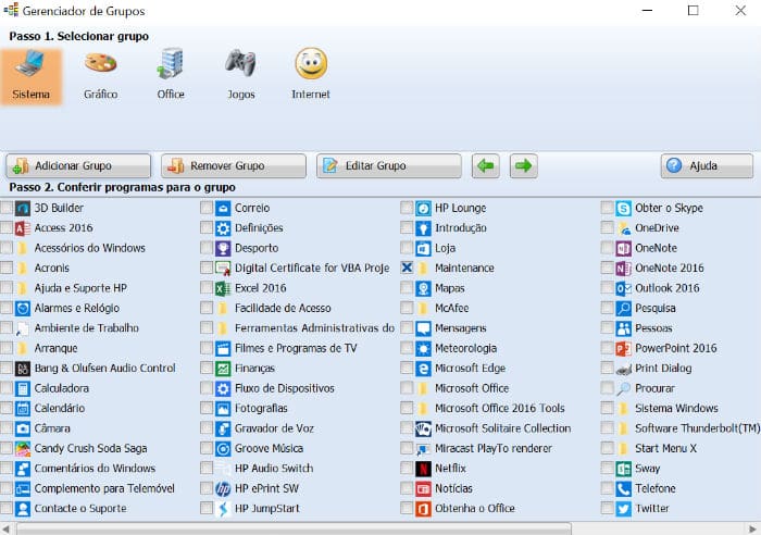 Agora ligue a opção ‘Ativar Grupos Virtuais’. Como pode ver na janela de preview, em cima, aparece um menu novo com grupos de ficheiros: ‘Sistema’, ‘Gráfico’, ‘Office’ e ‘Jogos’, por exemplo. Isto serve para agrupar de forma automática ficheiros que tenham que ver com a designação do grupo. Se clicar em ‘Gerenciar Grupos…’ pode alterar o nome do mesmo e escolher que programas/ficheiros serão incluídos em cada um deles.