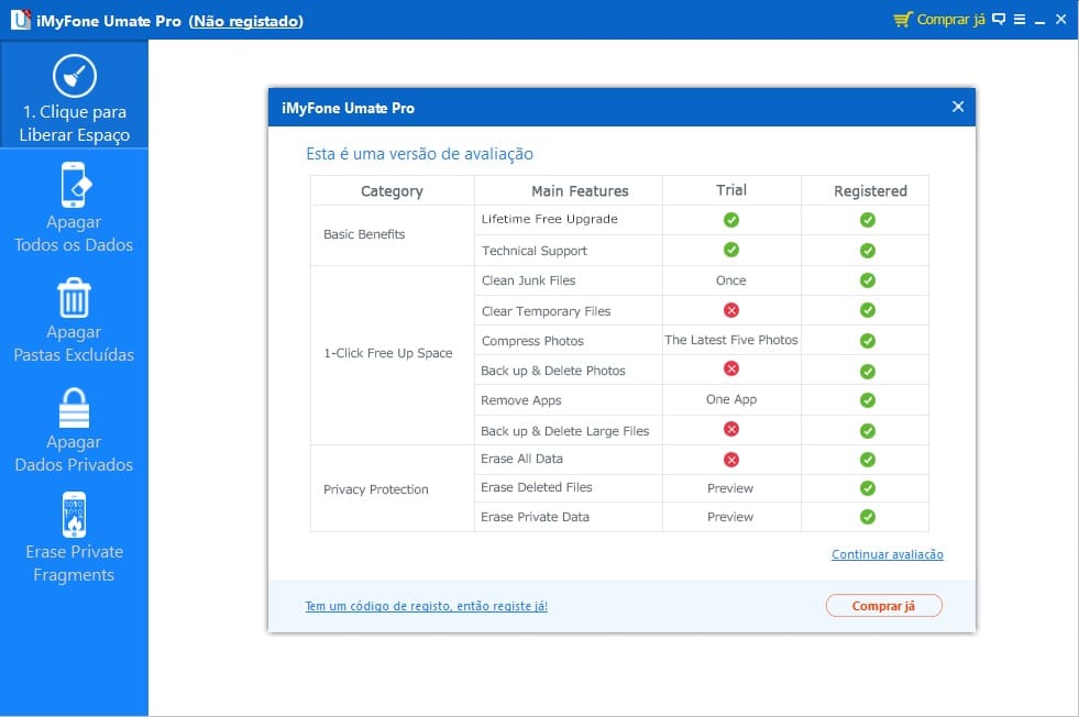 Em termos de funcionalidades de protecção de privacidade, apenas terá acesso à visualização dos ficheiros eliminados e de dados privados, sendo impossível eliminar os mesmos. Claro que para contornar estas limitações, bastará introduzir o código de registo que lhe será enviado pela iMyFone quando adquirir as aplicações completas.