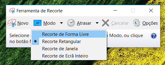 A Ferramenta de Recorte do Windows 10 tem agora um novo botão chamado ‘Modo’ que substitui o menu dropdown que aparecia quando clicávamos na pequena seta ao pé da opção ‘Novo’. A partir deste botão é possível seleccionar o tipo de captura de ecrã que quer fazer: Recorte de Forma Livre, Recorte Rectangular, Recorte de Janela e Recorte de Ecrã Inteiro.