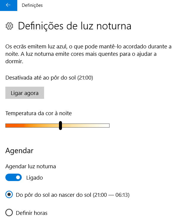 Para usar esta nova opção, entre em ‘Iniciar’ > ‘Definições’ > ‘Sistema’ > ‘Ecrã’ > ‘Definições de luz noturna’ e ajuste os horários ao activar ‘Definir horas’ em ‘Agendar’. Por defeito, esta opção activa-se à hora do pôr do Sol e desliga-se ao nascer do Sol (está ajustada ao fuso horário do computador, em Portugal das 21 às 6:13). Nesta janela, é ainda possível mudar a tonalidade do ecrã no slider ‘Temperatura da cor à noite’: para a direita, mais branco; para a esquerda mais laranja (mais “quente”).