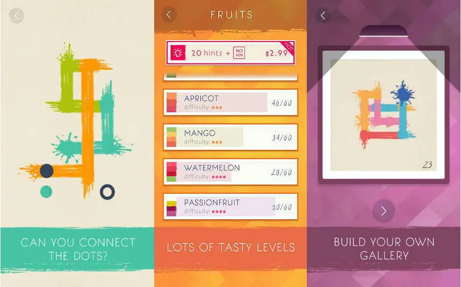 Mas, antes de ter a sua mini-galeria de arte da Splashy Dots no telefone, vai ter de criar primeiro as telas, ao desvendar pequenos desafios. Para isso, vai precisar de conseguir unir os pontos que aparecem no ecrã, como pequenos puzzles coloridos.