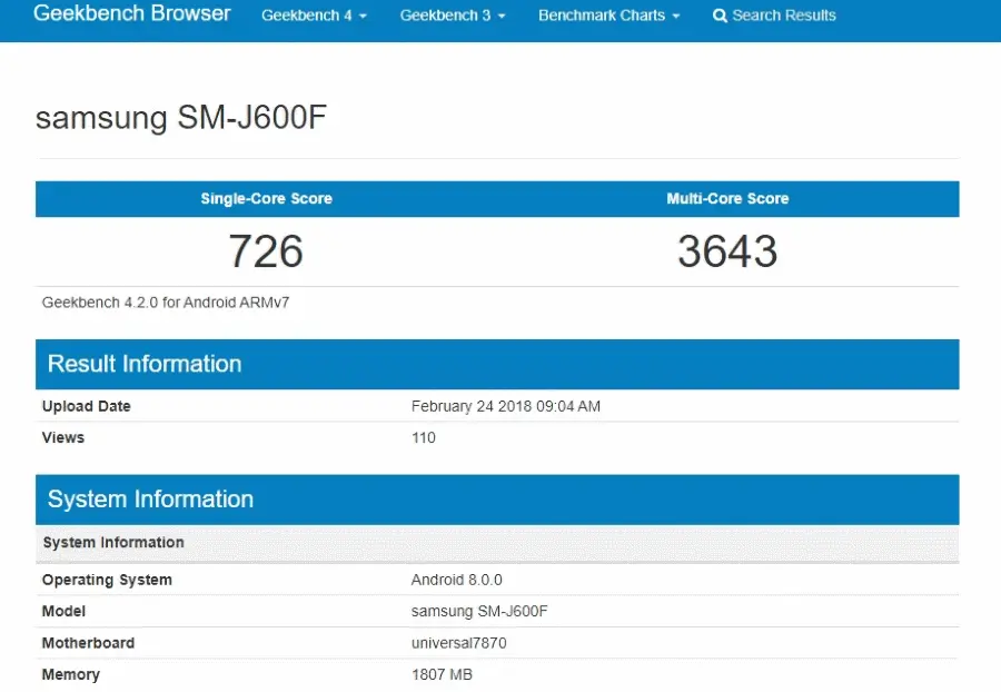 O Samsung SM-J600F, que obteve 726 e 3643 pontos nos testes single-core e multi-core, respectivamente, também dispõe de 2GB de memória, utiliza o Android 8.0 Oreo e deverá vir acompanhado dos smartphones Galaxy J4 e J8.