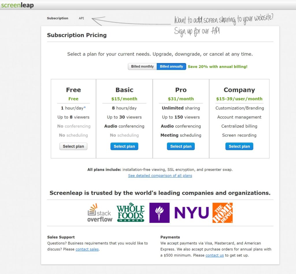 O Screenleap existe em duas versões: a gratuita, que limita o tempo de emissão a uma hora e a oito receptores. E a paga que tem três planos que se pagam ao mês e que vão dos 15 dólares por oito horas de streaming para um máximo de 30 receptores, até à conta de empresa que é ilimitada no tempo e paga por utilizador e ainda dispõe de possibilidade de personalização e gravação.