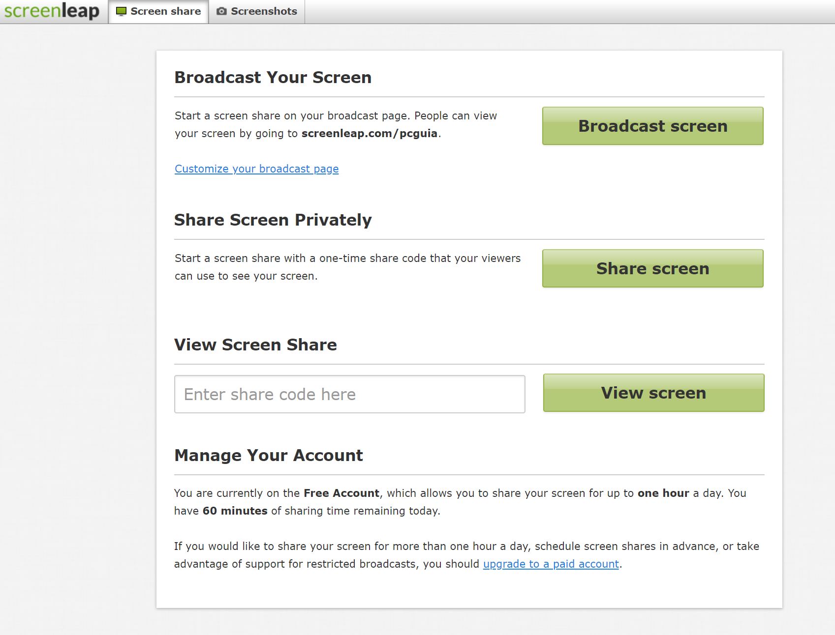 2- No ecrã seguinte aparecem três botões, a primeira: ‘Broadcast Screen’, esta opção permite fazer uma emissão pública do ecrã do computador. Nesta página aparece o URL personalizado que pode distribuir para que se consiga ver a emissão (no nosso caso é screanleap.com/pcguia).