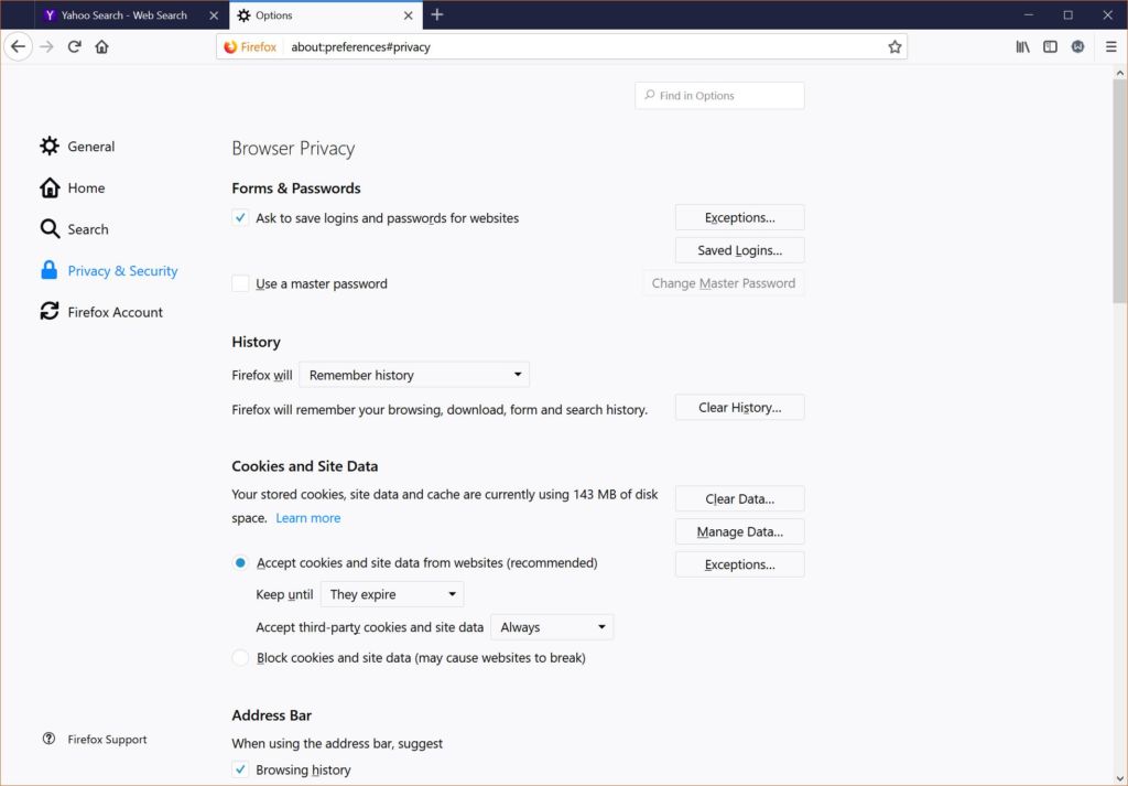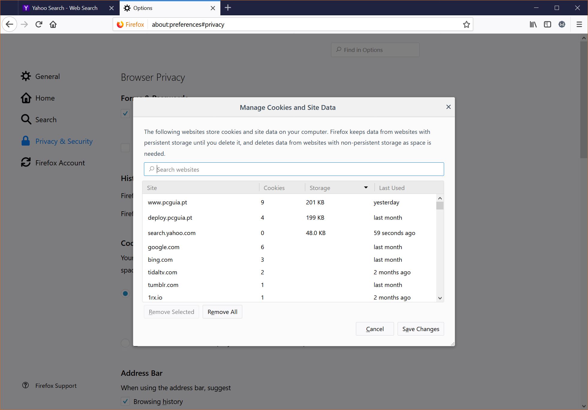 Clique no menu com três riscos paralelos que está no canto superior direito da janela do Firefox (também conhecido como ‘Hamburger menu’) e escolha ‘Options’, ‘Privacy & Security’. Aceda a ‘Cookies and site data’.