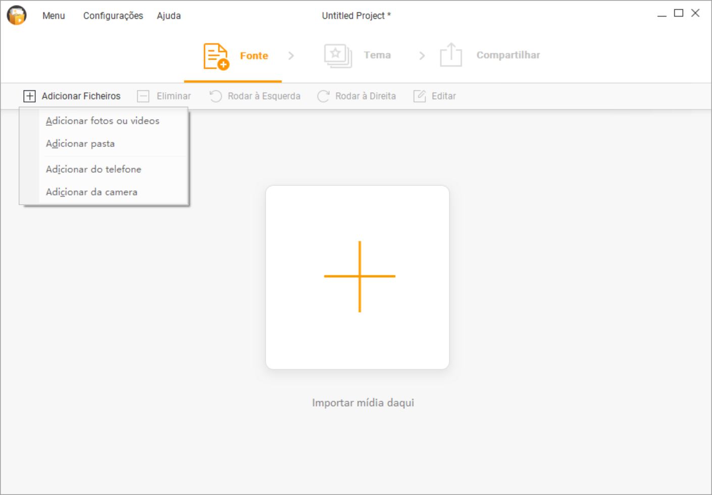Quando abre o Slideshow Maker a a interface vai automaticamente para o primeiro passo, que é adicionar as imagens que vai usar no seu slideshow. Pode fazê-lo arrastando uma, ou mais imagens directamente para a janela. Se clicar em ‘Adicionar ficheiros’, pode escolher entre usar ficheiros individuais ou o conteúdo de uma pasta. De seguida abre-se uma janela de selecção para ficheiros ou pastas padrão do Windows que pode utilizar para escolher. Se ligar o smartphone ao computador também pode importar fotos directamente do dispositivo.