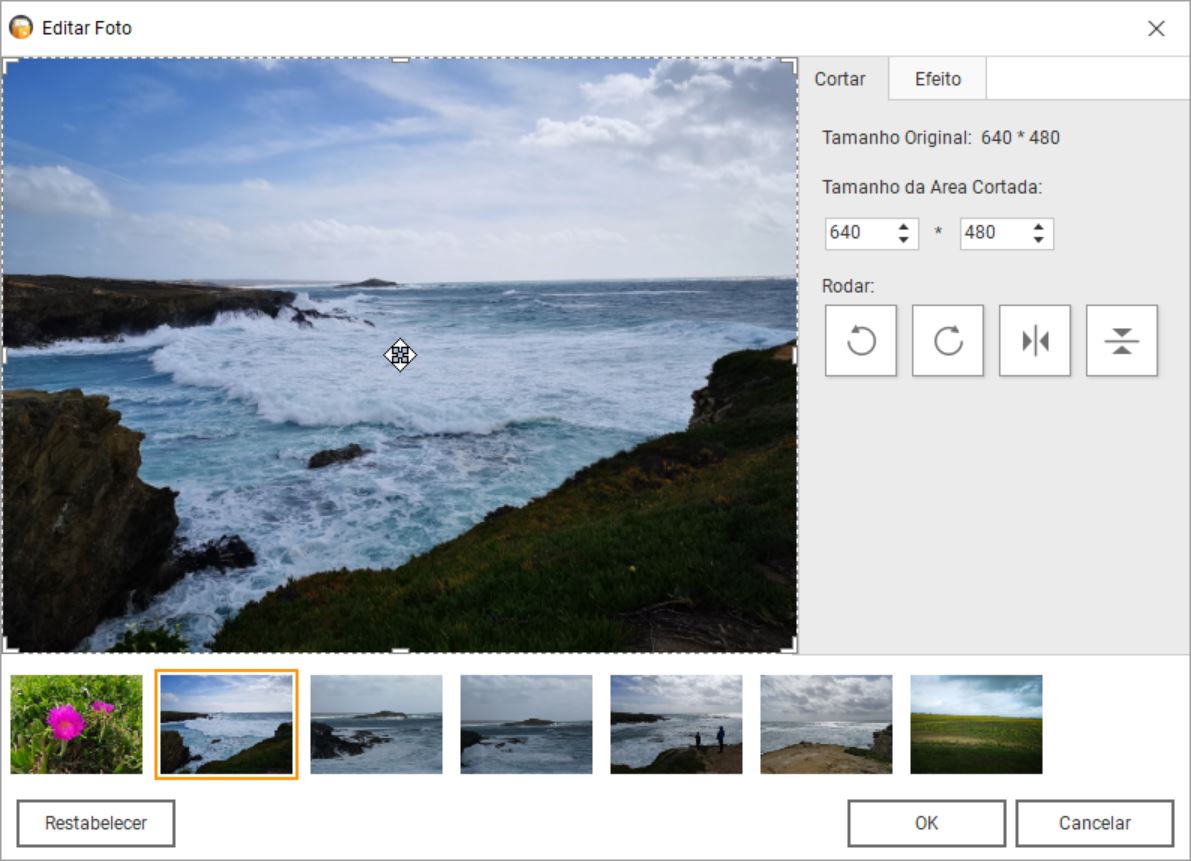 Para reenquadrar uma foto, basta arrastar os cursores que estão nos cantos e depois clicar em ‘OK’. Se se arrepender pode sempre clicar em ‘Restabelecer’ para voltar à foto original.