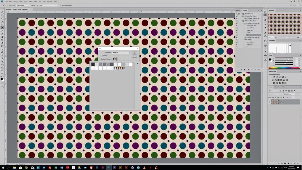 Mantenha o padrão simétrico. Nos escolhemo s quatro círculos, espaçados em cada quarto da tela. Depois juntámos círculos mais pequenos, saindo para fora dos contornos para que se juntem quando o padrão for aplicado. Agora escolha uma cor de fundo e vá ao menu ‘Edit’,e ‘Define pattern’, dê um nome e faça Ok.
