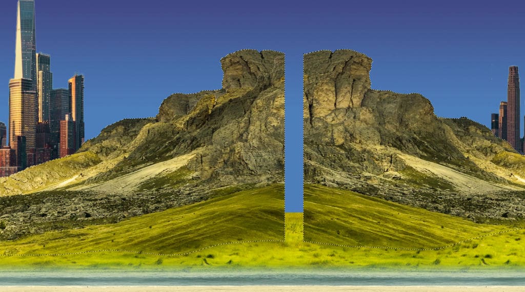 O nosso primeiro marco será uma imagem de uma cidade. Coloque-a na sua imagem e ‘rasterize’ a camada. Depois seleccione metade dela e Ctrl/clique com o botão direito do rato. Escolha ‘Layer Via Cut’. Desloque o lado direito da imagem para o extremo esquerdo, e o esquerdo para a direita.