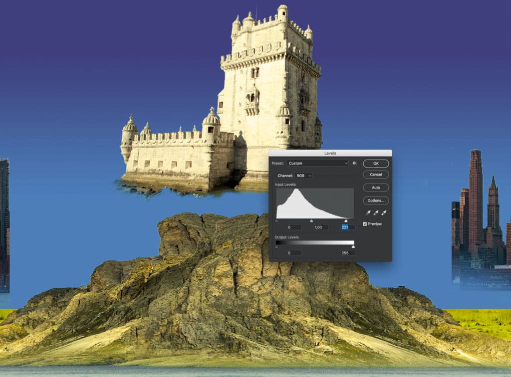 Agora escolha a ferramenta de tratamento de cor que achar mais interessante, depende sempre da foto de montanha escolhida. Neste exemplo o melhor é os ‘levels’.