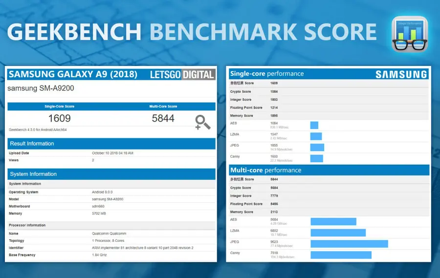 Uma notícia do website Lets Go Digital dá conta que um novo smartphone da Samsung, o Galaxy A9, já foi testado com a aplicação de medição de desempenho Geekbench. O dispositivo móvel, com a referência SM-A9200, obteve 1609 e 5844 pontos nos testes single-core e multi-core, respectivamente.