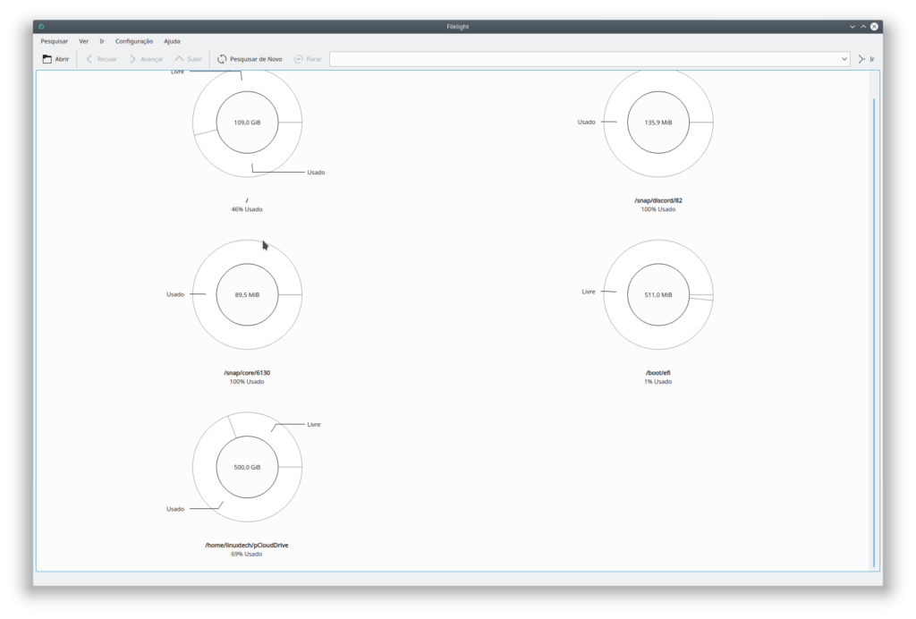 Quando o programa é aberto, por omissão, aparecem em forma circular, não só os discos físicos como algum serviço na nuvem que usem e que tenha integração com o gestor de ficheiros da distribuição linux, no meu caso uso o Pcloud, como podem ver na imagem.