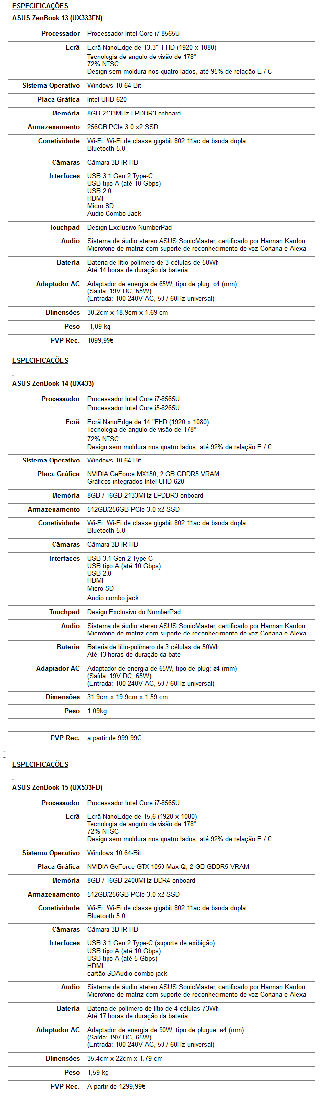 O ZenBook 13 (UX333), o ZenBook 14 (UX433) e o ZenBook 15 (UX533) estão disponíveis em Portugal com um PVP recomendado a partir de 999,99 euros.
