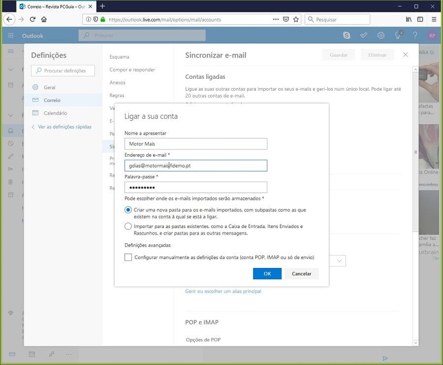 Em diversas situações, o passo anterior seria suficiente para finalizar a configuração do acesso à sua conta de e-mail, mas alguns servidores requerem uma configuração detalhada do acesso ao mesmo, através da introdução das configurações manuais POP ou IMAP.