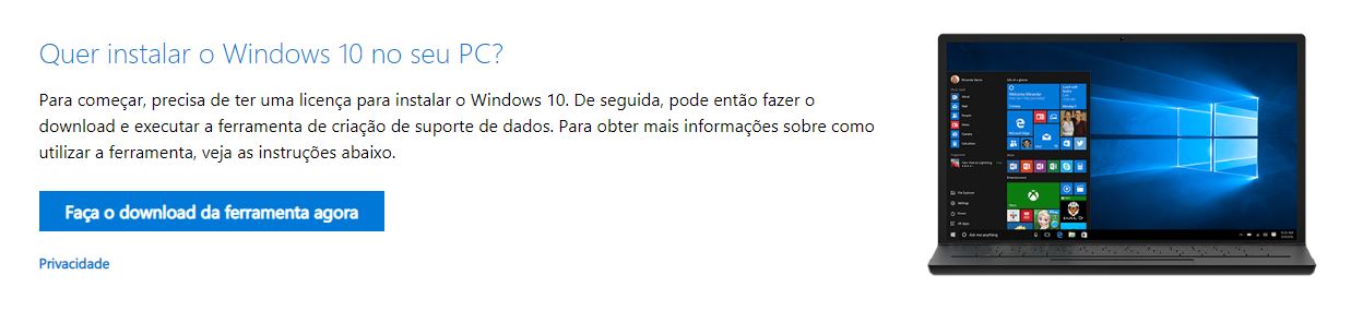 No site de suporte da Microsoft clique em ‘Faça o download da ferramenta agora’.