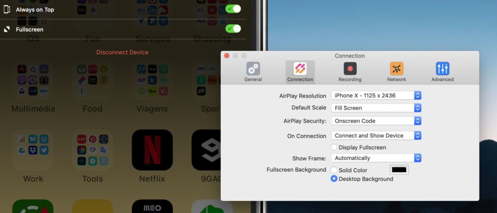 Em ‘Connection’ vamos mudar duas coisas: na área ‘AirPlay Resolution’ escolha a qualidade respeitante ao seu modelo de iPhone ou iPad; em ‘Default Scale’ seleccione ‘Best for Retina (caso tenha um computador Apple com este tipo de ecrã). Pode ainda marca a opção ‘Display Fullscreen’ se não quiser ver a dock ou a barra de menus e mude o ‘Fullscreen Background’ para ‘Solid Color’ a preto, para que a imagem reflectida do iPhone no Mac fique com mais destaque.