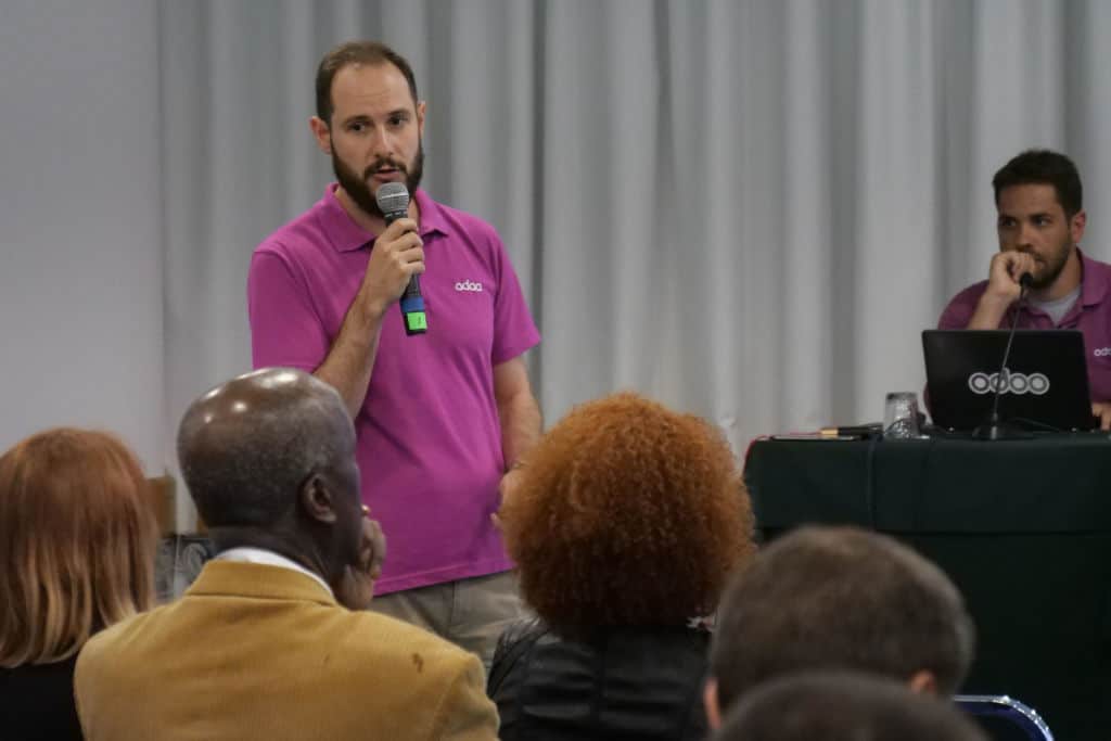 Assisti a apresentações bem preparadas, como foi o caso do Gabriel Morais que trabalha em Bruxelas, que falou um pouco sobre a historia do Odoo, das suas vantagens por dizer que “O Odoo reduz tarefas administrativas, aumentando assim as vendas, impulsionando o marketing e isso tem resultado em parcerias com grandes empresas que têm apostado na plataforma”. Sendo o core open source, é um ponto forte que tem contribuído para o seu desenvolvimento e por isso a frase “Acreditamos no Open Source” teve destaque na apresentação.