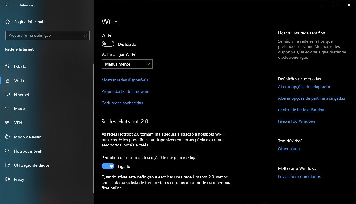 Se a ligação à rede não funcionar experimente desligar a rede wi-fi. Para o fazer, clique com o botão direito do rato em cima do ícone e escolha a opção ‘Abrir definições de Rede e Internet’, na janela que aparece clique em ‘Wi-Fi’ e use o interruptor para a desligar.