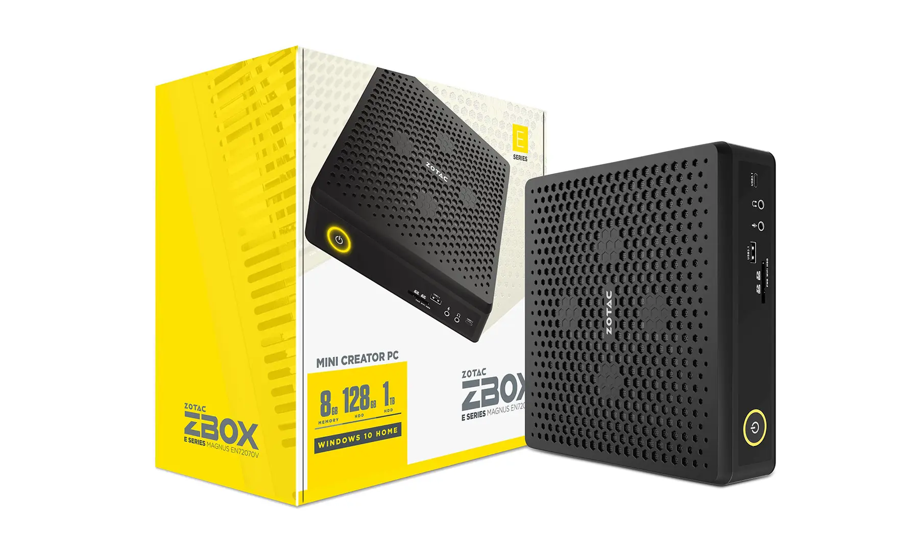 O modelo ZBOX Magnus-E, com 62,2 mm de espessura, está disponível com um processador Intel Core i5 ou Core i7 da 9ª geração, 8GB de memória DDR4, uma solução de armazenamento SSD M.2 de 128GB, um disco rígido de 2,5 polegadas de 1TB, duas tomadas HDMI 2.0, DisplayPort 1.4, LAN, duas tomadas USB 3.1 Gen2 (uma Type-C) e quatro tomadas USB 3.0.
