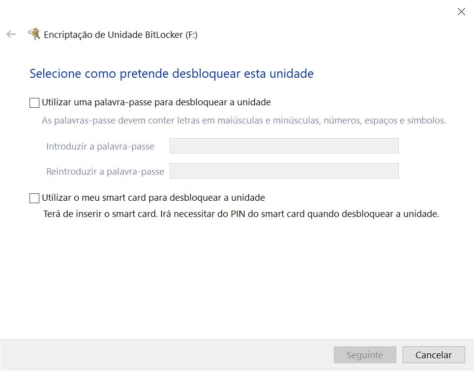 Ligue a opção ‘Utilizar uma palavra-passe para desbloquear a unidade’ e insira uma password. Confirme-a voltando a inseri-la no campo ‘Reintroduzir a palavra-passe’ e clique no botão ‘Seguinte’.