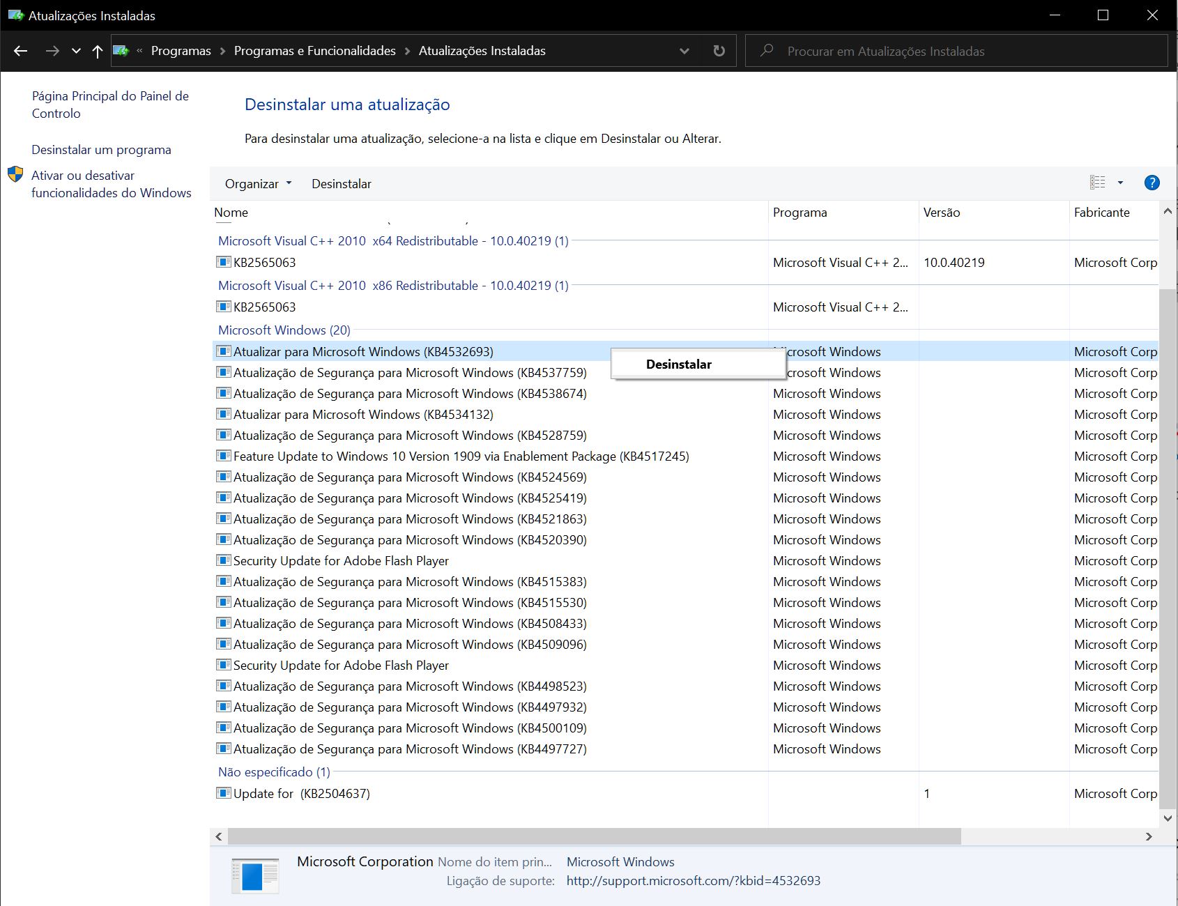 Se tiver sido afectado por este problema aceda ao ‘Painel de controlo’, ‘Programas e Funcionalidades’, ‘Ver actualizações instaladas’, procure actualização KB4532693, clique com o botão direito em cima dela e escolha a opção ‘Desinstalar’.