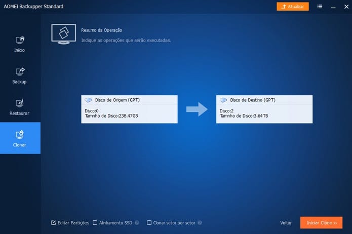 Para dar início ao processo de clonagem, carregue em ‘Próximo’ – o AOMEI Backupper avisa-o de que os dados serão apagados no disco externo – clique em ‘Ok’ e depois em ‘Iniciar Clone’.