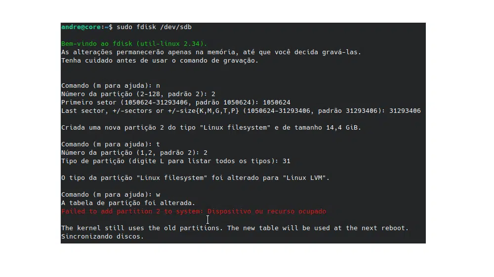 Sempre que fizerem alguma alteração nunca esquecer de usar a opção ‘w’ para gravar a tabela no disco. Muita atenção no disco e na partição que efectivamente pretendem alterar. Se, por alguma razão, ocorrer algum engano e não tiverem usado o ‘w’, podem cancelar com ‘Ctrl+Z’.