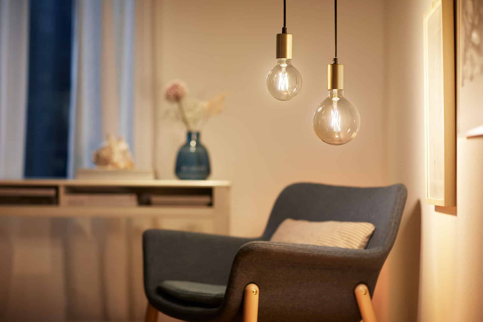 PCGuia > Notícias > Signify apresenta nova geração de lâmpadas e acessórios inteligentes WiZ > WiZ_in situ_vintage_range_G120_G95_amber_glass_light_on_warm