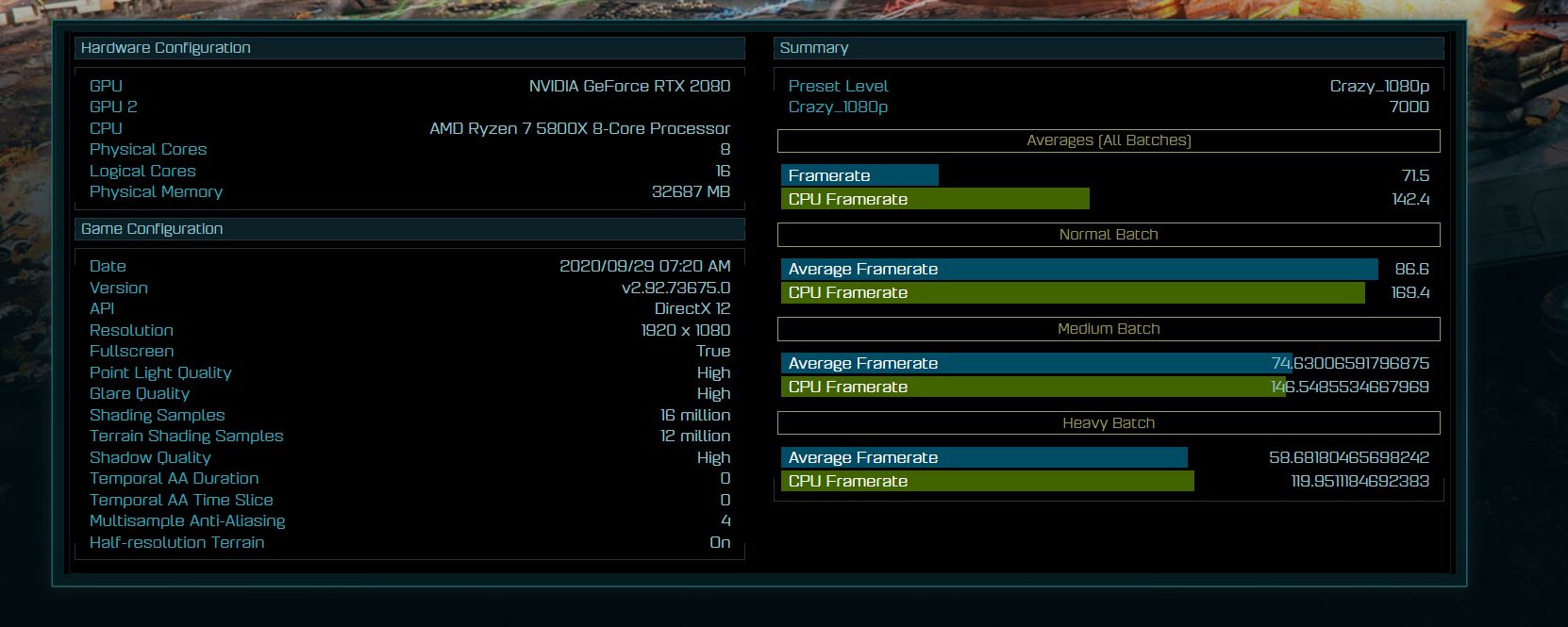 Posteriormente foram feitos outros testes, que colocaram frente a frente o mesmo AMD Ryzen 7 5800X face a um AMD Ryzen 7 3800X, utilizando supostamente o mesmo sistema, embora a uma resolução inferior (1080p). Neste caso, a diferença de resultados é ainda mais flagrante, com o valor médio do novo Ryzen 7 5800X a registar 142,4 fps, e o Ryzen 7 3800X a registar apenas 88,6 fps.