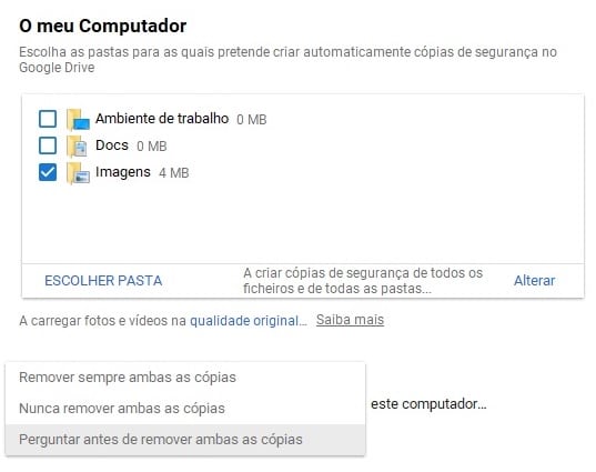 7 – Pode alterar as configurações de backup a qualquer momento clicando no ícone Cópia de Segurança e Sincronização que está na barra de tarefas do Windows, depois nos três pontinhos e em ‘Preferências’. Além de poder adicionar ou remover pastas do backup, pode alterar o que acontece quando apaga uma foto do computador. Se clicar em ‘Perguntar antes de remover ambas as cópias’ pode alterar para ‘Remover sempre ambas as cópias’ (as fotos serão excluídas dos dois locais em simultâneo) ou ‘Nunca remover ambas as cópias’. Não se esqueça de clicar em ‘Ok’ para gravar as alterações.