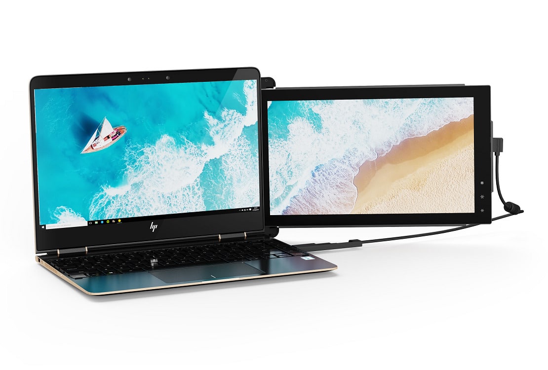 Trata-se de um monitor secundário com catorze polegadas que tem um sistema engenhoso que o fixa na tampa de um computador portátil através de ímanes. O sistema de fixação é composto por um invólucro com uma calha que permite fazer deslizar o ecrã para a direita ou para a esquerda, transformando o computador num sistema de dois ecrãs contíguos como muitos de nós usamos em cima da secretária. Isto é engenhoso e permite instalar/remover o monitor rapidamente – no entanto, é preciso ter algum cuidado porque basta um pequeno embate para soltar o monitor da tampa do portátil.