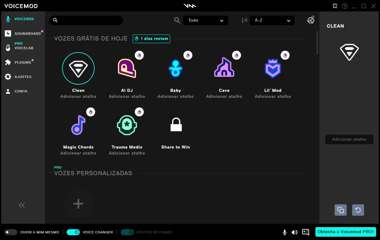 Passo 3 (PresetVoice): Após configurados os dispositivos, encontrará o painel do ecrã principal do Voicebox. Se estiver a usar a versão gratuita, encontrará no topo algumas das vozes disponibilizadas gratuitamente, bem como o tempo que resta para as poder usar, altura em que serão disponibilizadas outras. Se utilizar a versão paga, terá acesso a todas as vozes da aplicação. Escolhendo uma das vozes disponiveis, encontrará no lado direito um ecrã que lhe permitirá ajustar vários parâmetros, como a Ressonância, o Tom, o Volume da voz e outros. Na barra inferior da aplicação, active a opção VoiceChanger, e está pronto para usar o Voicemod.