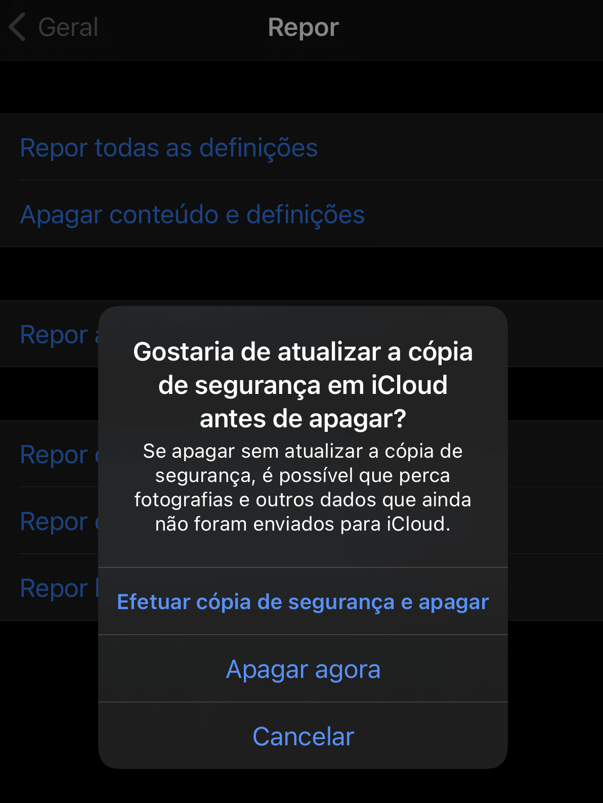 7 – A nossa última sugestão deve ser o seu plano de recurso. Se concluir que nenhuma das sugestões que demos tem impacto significativo na redução do espaço ocupado pelo grupo ‘Outro’, experimente fazer reset total ao iPhone/iPad. Primeiro, ligue-o ao Mac e, no iTunes ou na janela do dispositivo que fica disponível a partir do Finder (versões mais recentes do macOS), clique em ‘Efectuar cópia de segurança’ para fazer backup dos seus dados. Depois, volte ao iPhone/iPad, entre nas ‘Definições’ > ‘Geral’ >’Repor’ e toque em ‘Apagar conteúdo e definições’, seguido de ‘Apagar agora’.