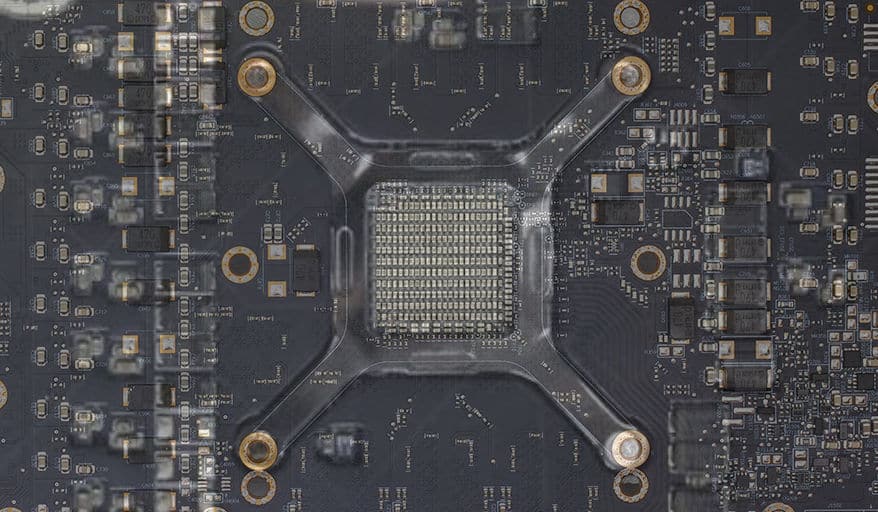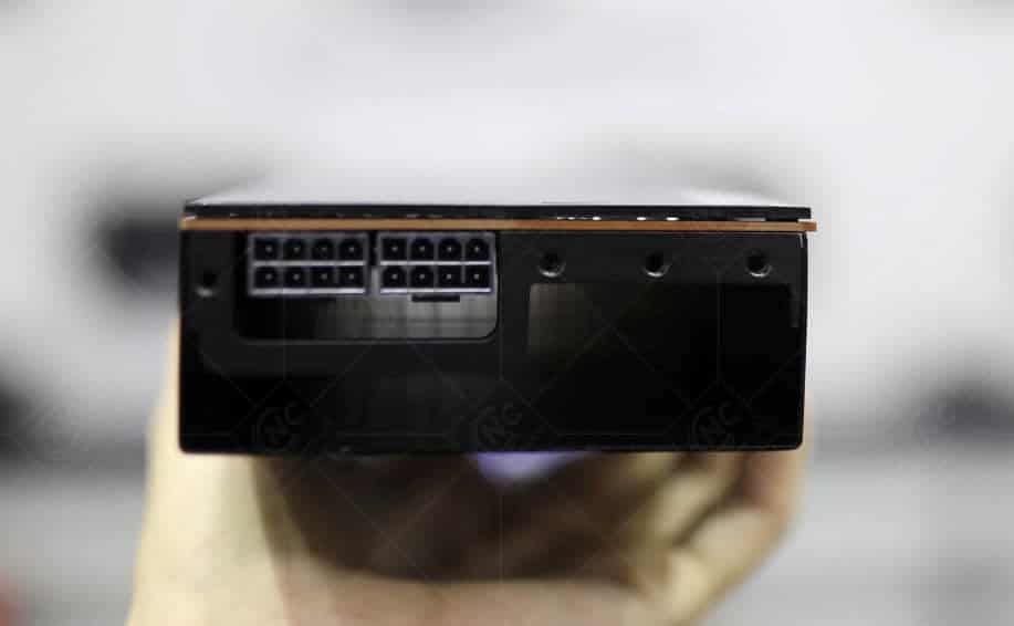 Pelo desenho do circuito de alimentação, e pelos componentes electrónicos dispostos na parte traseira da placa, dá para identificar na mesma o GPU Navi21, o mesmo que equipa as placas gráficas Radeon RX 6800, RX 6800 XT e RX 6900 XT. Curiosamente as ligações de alimentação PCIe de oito contactos estão colocadas no painel traseiro, em vez do superior, como habitualmente usado.