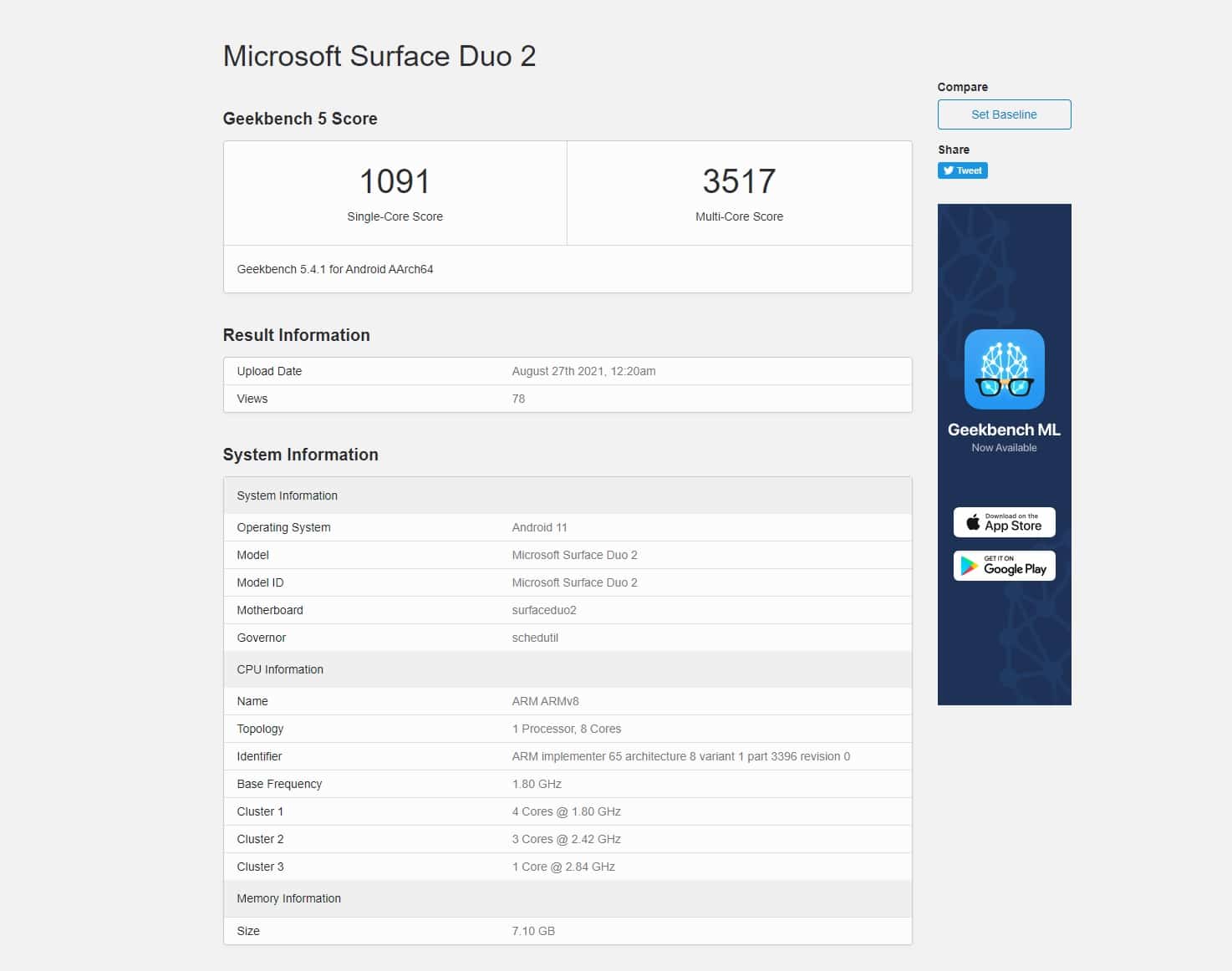 A segunda geração do smartphone de duplo ecrã da Microsoft foi apanhado na lista de resultados do popular software de benchmark Geekbench5, com resultados 1091 pontos no testes de Single-Core (um núcleo) e 3517 pontos no teste Multi-Core (múltiplos núcleos). Este resultado, juntamente com a descrição da informação do sistema do teste publicado, dão a entender que a Microsoft optou por utilizar o SoC (System-on-Chip) Qualcomm Snapdragon 888.