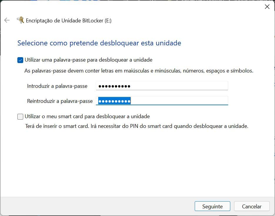 Escolha a forma de desbloqueio, que pode ser através da inserção de uma password ou através de um cartão smart card.
