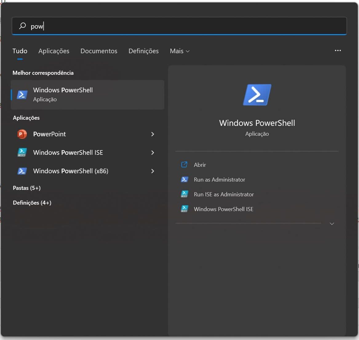 No Windows 11, clique na lupa que está na Barra de tarefas e escreva ‘powershell’. Escolha a opção ‘Run as administrator’.