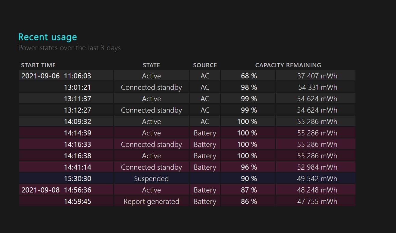 O ficheiro é aberto automaticamente no browser que está definido no sistema operativo. No relatório pode ver as especificações da bateria, todas as vezes que foi utilizada nos últimos três dias, a autonomia média da bateria estimada baseada nos últimos ciclos de utilização e outras estatísticas.
