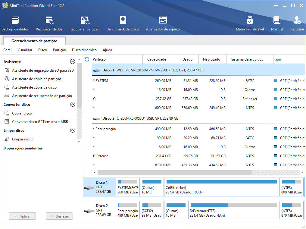 Depois de instalado, abra o software para ver os discos rígidos ligados ao PC. No nosso caso, o Disco 1 é um SSD interno e o Disco 2 é a unidade externa que vamos dividir.
