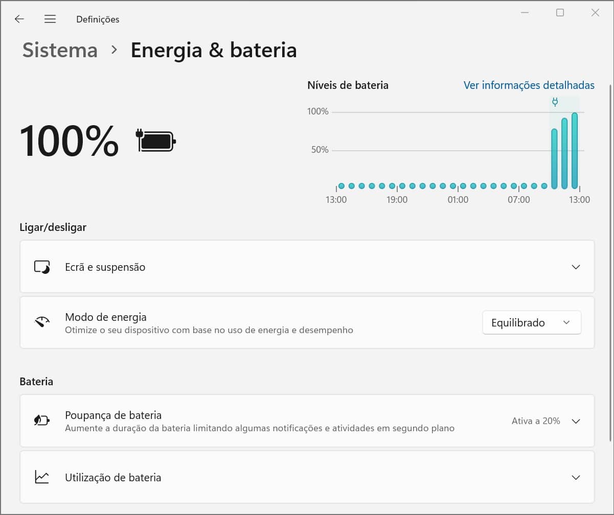 Abra a aplicação Definições e escolha a opção ‘Energia & Bateria’ para ver informação completa sobre o consumo de energia da bateria do seu portátil, pode até seleccionar ‘Utilização de bateria’ para ver ainda mais detalhes.