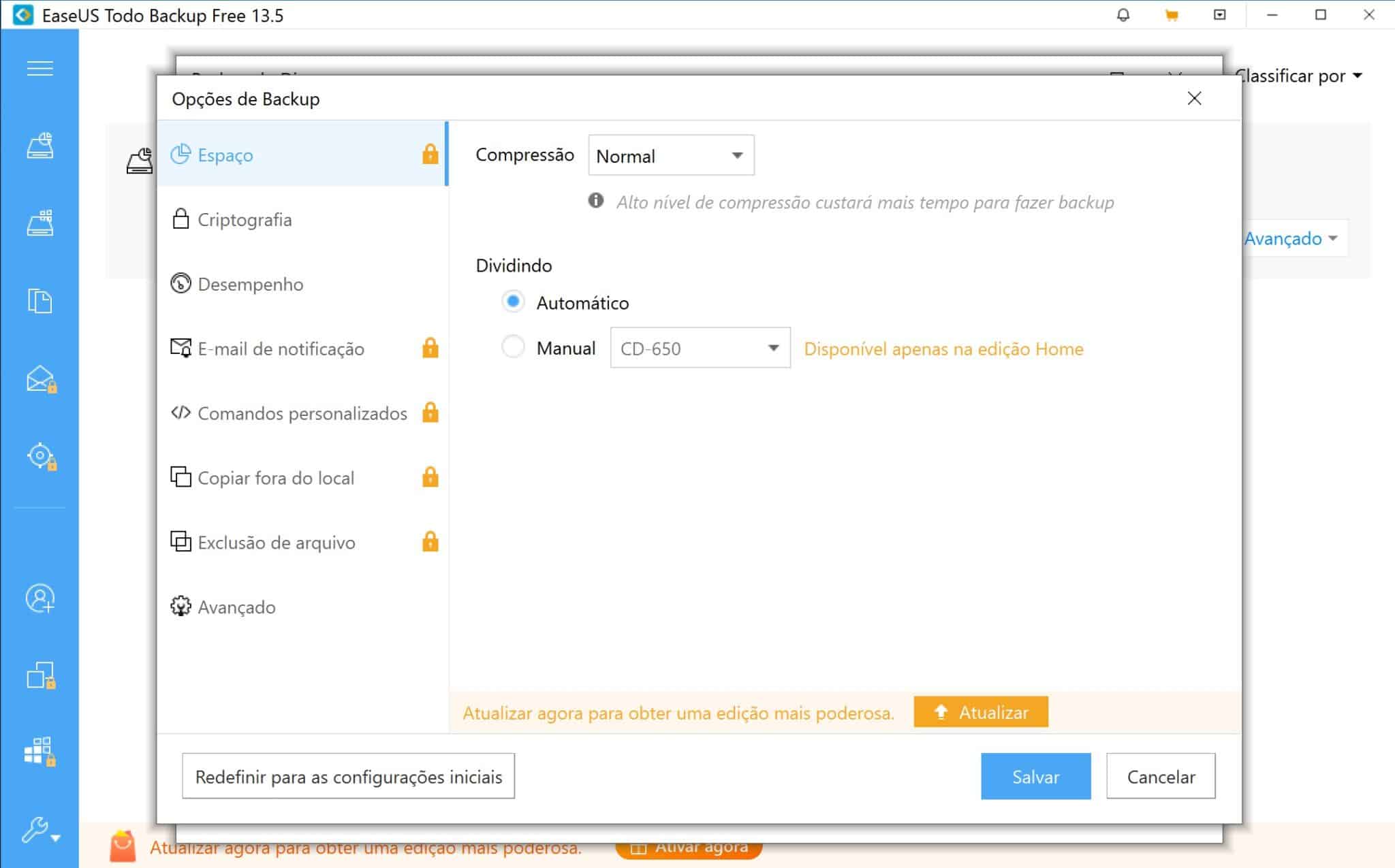 - Antes de clicar em ‘Avançar’ para iniciar a cópia de segurança, pode clicar em ‘Opções do backup’ para alterar a forma como a aplicação vai fazer cópia. Neste ecrã pode também definir uma palavra-chave para proteger a cópia de segurança. Este ecrã tem mais opções que estão desactivadas por estarmos a usar a versão gratuita do programa. Estas opções são denotadas com um cadeado amarelo.