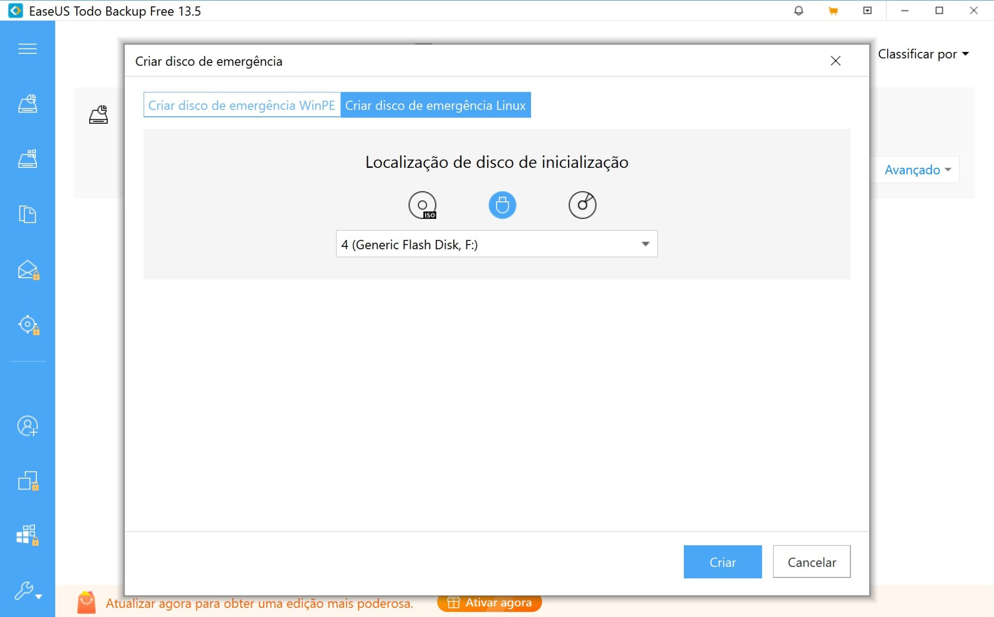 - No ecrã seguinte, clique em ‘Criar disco de emergência Linux’. A opção ‘Criar disco de emergência WinPE’ não permite a clonagem do disco na versão gratuita do programa. De seguida escolha o suporte pretendido. Pode criar uma imagem ISO, criar uma pendrive de arranque ou gravar um disco óptico.