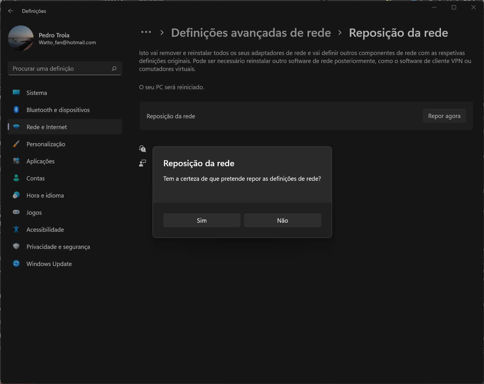 Assim que clicar em ‘Sim’, o sistema operativo remove e reinstala todos os adaptadores de rede e repõe todas as definições de rede. Para voltar a usar a ligação Wifi, terá de voltar a introduzir os dados de acesso à rede.