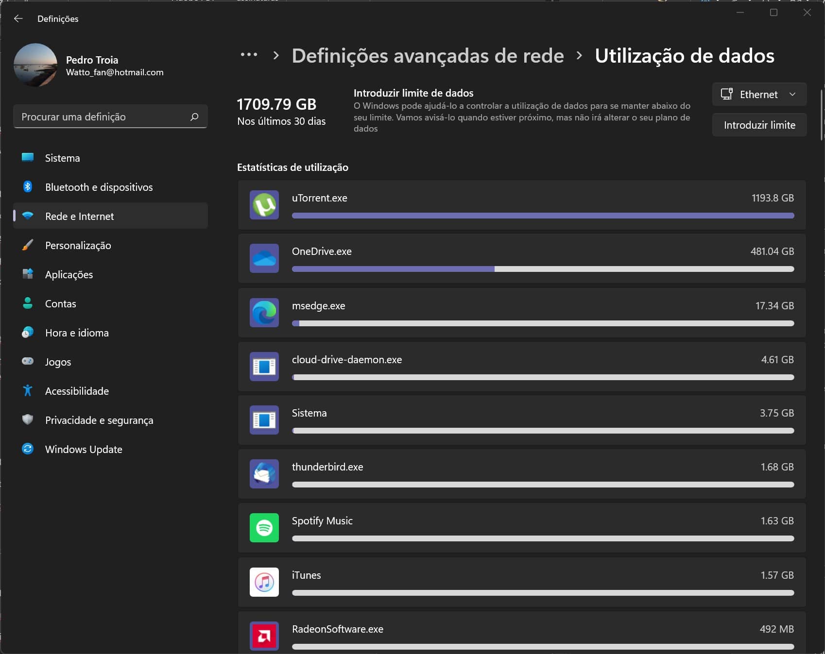 Na janela seguinte, aparece um ranking das aplicações que usaram mais dados num determinado adaptador.