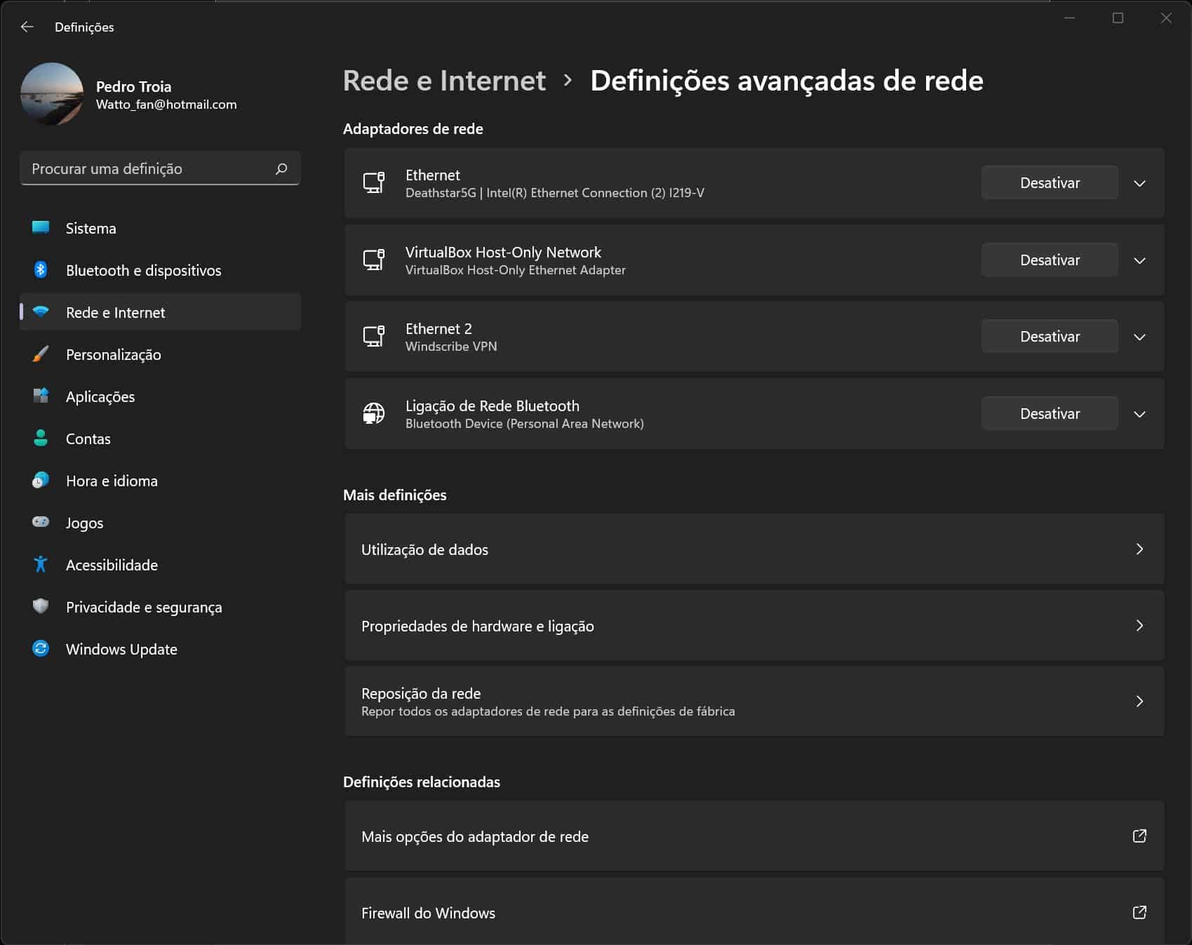 Neste ecrã pode clicar nos botões ‘Desactivar’ para desligar os vários adaptadores de rede que tiver no seu computador.