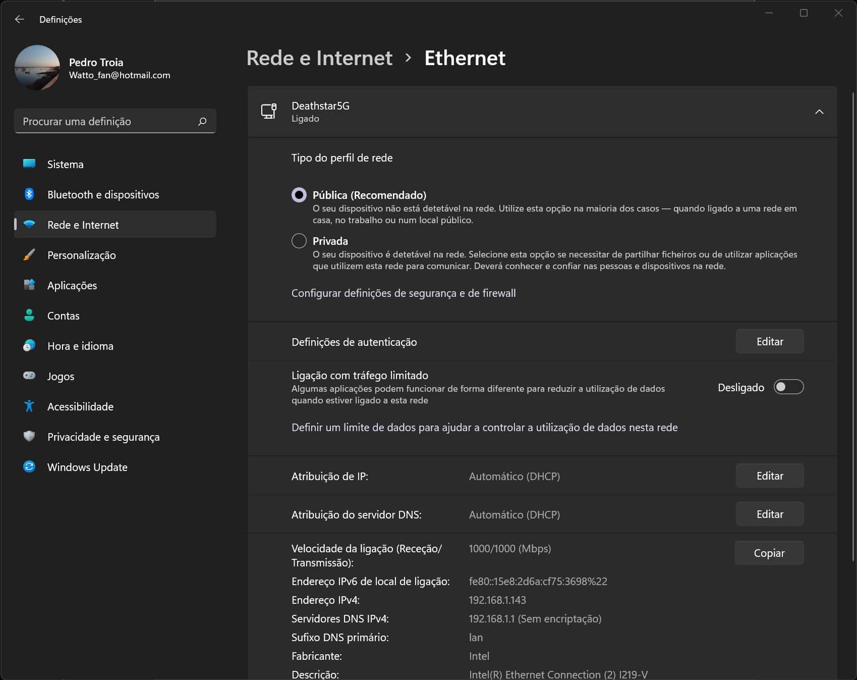 No fundo da janela, encontra toda a informação acerca do estado e configuração do adaptador de rede.