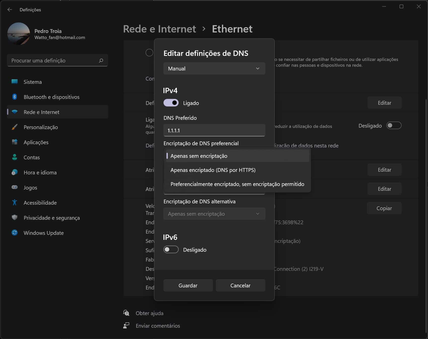 Se a configuração da encriptação das comunicações com os servidores DNS estiver correcta aparece a palavra ‘Encriptado’ junto a ‘Servidores DNS IPV4’.